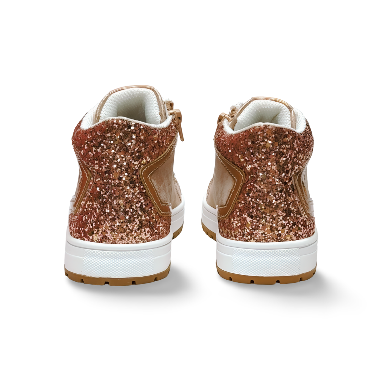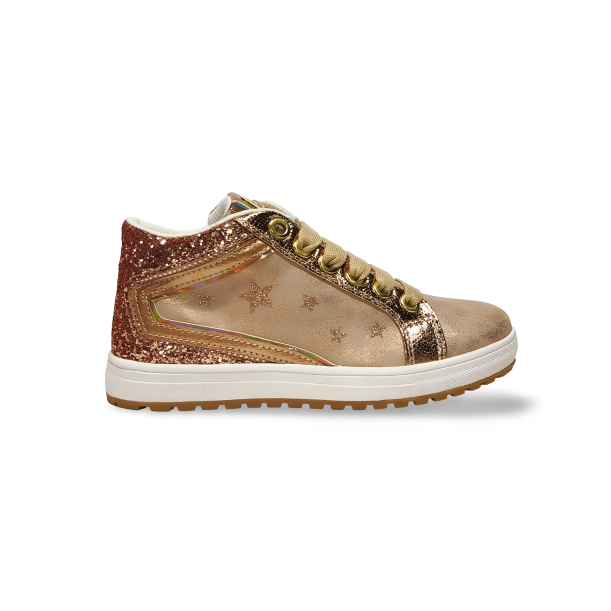 Zapatillas de estilo botín ideales para el día a día. En tono nude con detalles en purpurina al mismo tono, estampación de estrellas con purpurina nude en el lateral exterior. Su suela es en tono blanco con ribete en nude, además incorpora cordones y una cremallera en el lateral interior. La plantilla es extraíble.