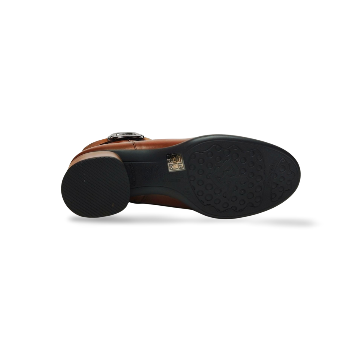 Este botín es la definición de elegancia funcional. Este modelo ha sido diseñado para quienes aprecian la sobriedad del cuero de alta calidad pero buscan un elemento diferenciador que eleve su conjunto. Es un botín versátil, perfecto tanto para eventos formales como para darle un aire sofisticado a un look diario. El elemento protagonista es su correa ancha en el tobillo rematada con una hebilla rectangular en acabado plomo. Confeccionado íntegramente en piel en tono cuero con un acabado liso y un brillo natural muy sutil que denota la calidad de los materiales. Su tacón de altura media y base ancha garantiza una distribución del peso óptima, permitiendo caminar con total estabilidad durante horas. La suela exterior es flexible y está diseñada para ofrecer un agarre máximo en diferentes superficies, evitando resbalones accidentales. Su puntera redondeada pero fina ofrece un ajuste cómodo para los dedos sin perder la estética refinada que caracteriza a la marca.