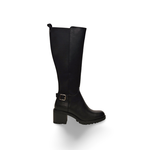 Estas botas negras de caña alta combinan un estilo clásico con las tendencias más actuales. Su diseño liso se complementa con un práctico panel elástico trasero y una cremallera interior, lo que garantiza un ajuste cómodo y flexible a la pierna. La llamativa hebilla metálica decorativa en el tobillo aporta un toque distintivo y sofisticado. El tacón ancho y estable, junto con la moderna suela dentada, proporciona comodidad durante todo el día y un agarre seguro, ideal para los looks de invierno.