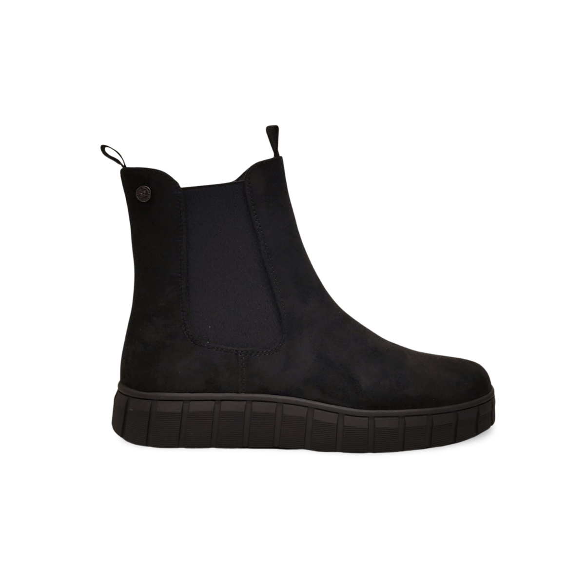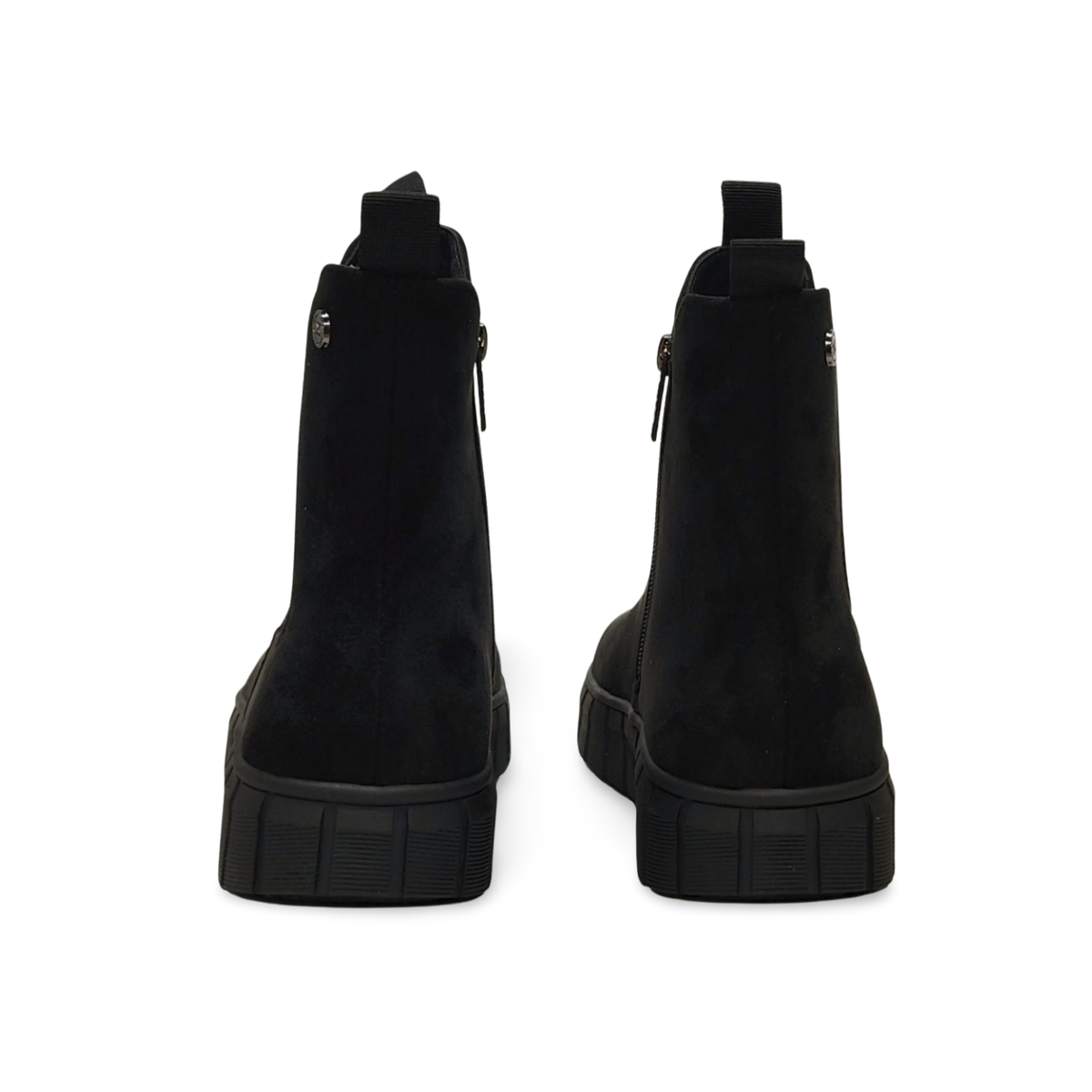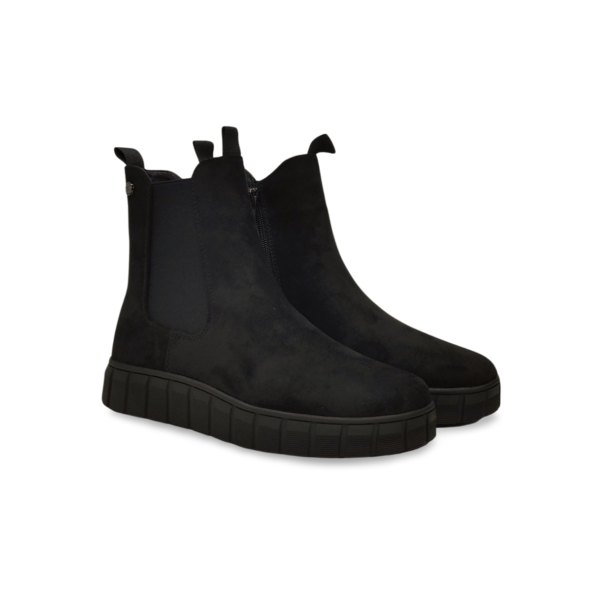 Descubre estos botines, la elección perfecta para un look casual y moderno. Estos botines estilo Chelsea en un versátil color negro combinan diseño y funcionalidad, ideales para el día a día. Fabricados en suave material textil, con acabado tipo antelina. Modelo de caña baja con paneles laterales elásticos y un práctico cierre de cremallera lateral, además de tiradores traseros y delanteros para un calce fácil y cómodo. Cuentan con una suela gruesa de goma dentada track, que es antideslizante y proporciona firmeza en cada paso.