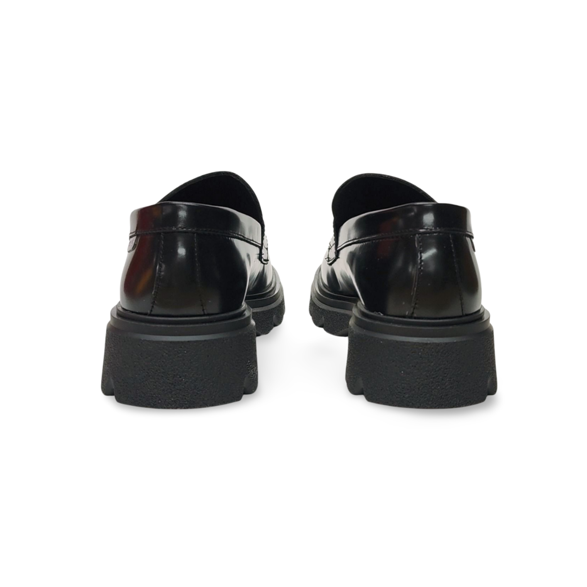 Mocasín con plataforma de acabado brillante. Ideales para el día en el colegio o para el fin de semana. En tono negro.
