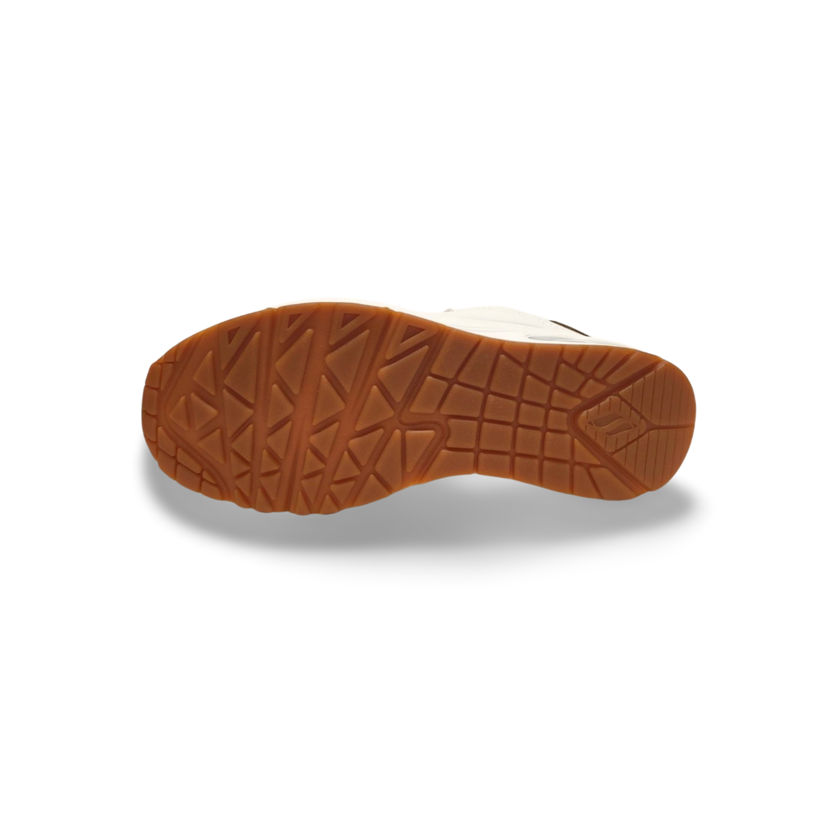 Sneaker de efecto piel en color blanco, con pieza de piel de ante en la parte trasera del talón en color cuero. Cuenta con cierre de cordones para una mayor sujeción al pie. Cómoda plantilla Air-Cooled Memory Foam. Media suela con cámara de aire visible Skech-Air.