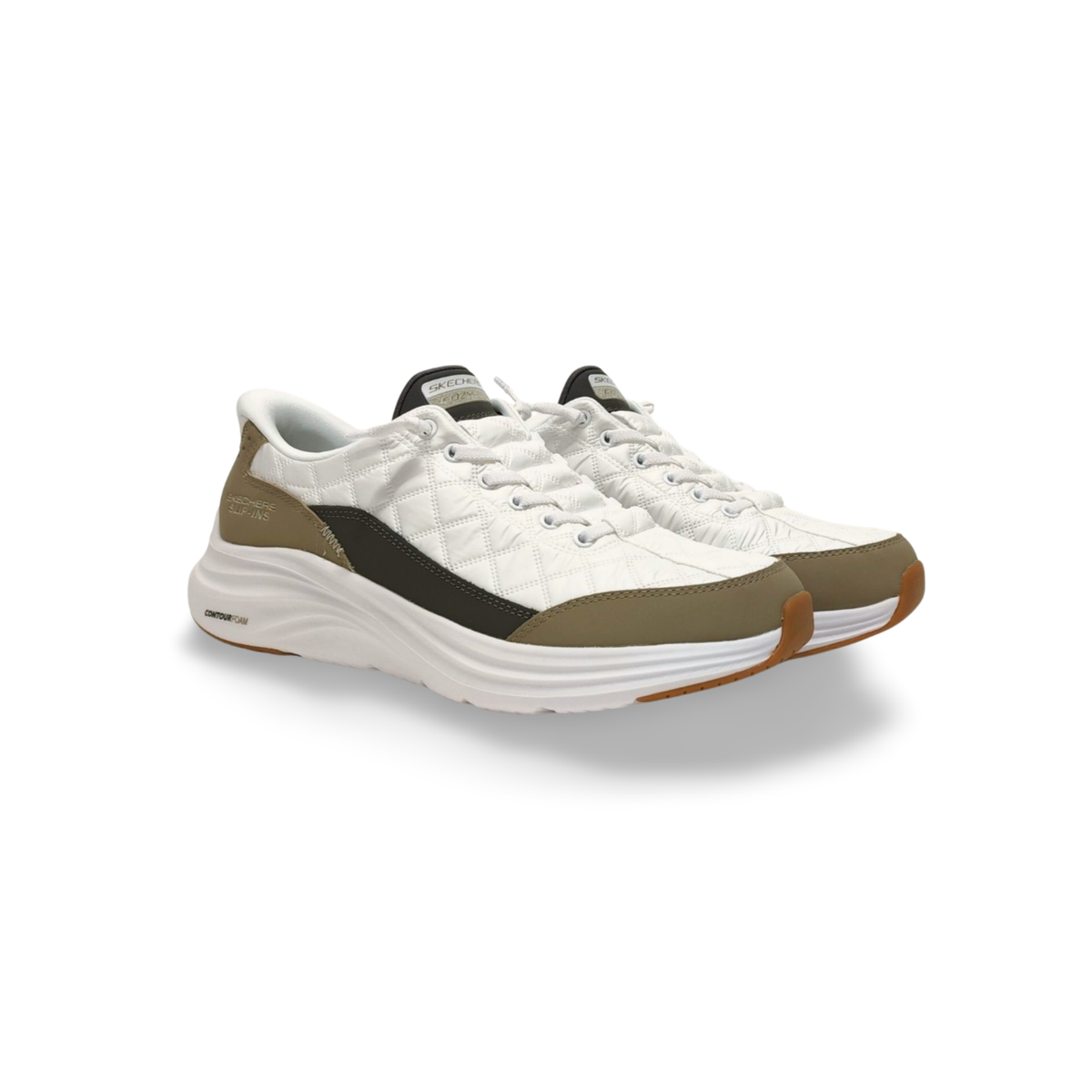 Las zapatillas Skechers Slip-Ins están diseñadas para brindar máxima comodidad, practicidad y un estilo moderno para el uso diario. Gracias a la innovadora tecnología Hands Free Slip-Ins™, permiten calzarse sin usar las manos, ofreciendo una experiencia rápida y sin esfuerzo. Su parte superior de material sintético acolchado con diseño acolchado tipo quilted proporciona un ajuste cómodo, resistente y elegante. Incorporan la exclusiva plantilla Air-Cooled Memory Foam®, que se adapta al pie y brinda una sensación suave y fresca durante todo el día. La entresuela con tecnología Contour Foam™ ofrece una amortiguación reactiva y soporte ergonómico, reduciendo el impacto en cada paso. Además, su suela de goma con excelente tracción garantiza estabilidad y seguridad en superficies urbanas. Este modelo combina tonos blancos, beige y negro, logrando un diseño versátil que se adapta fácilmente a looks casuales y deportivos. Lavables en lavadora.