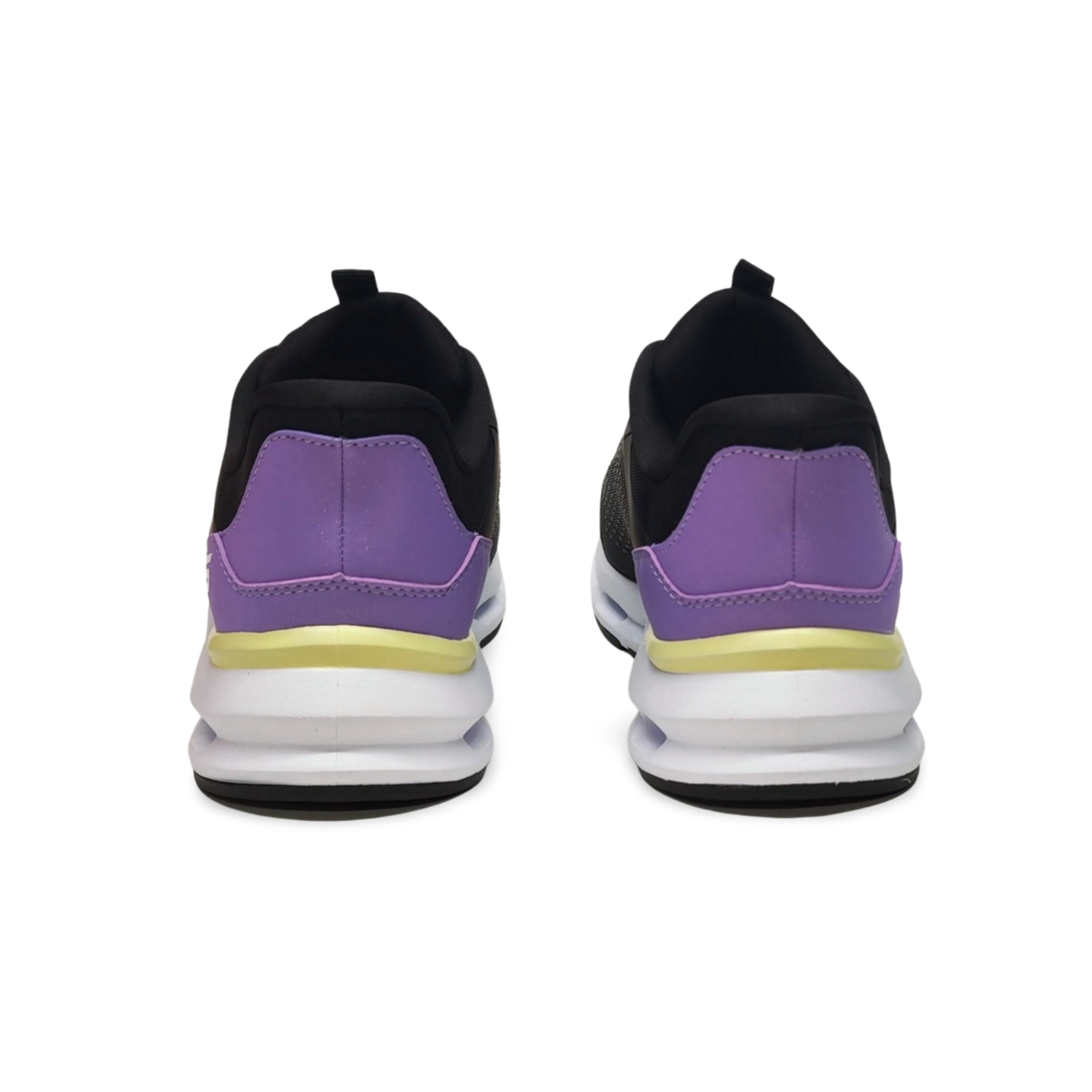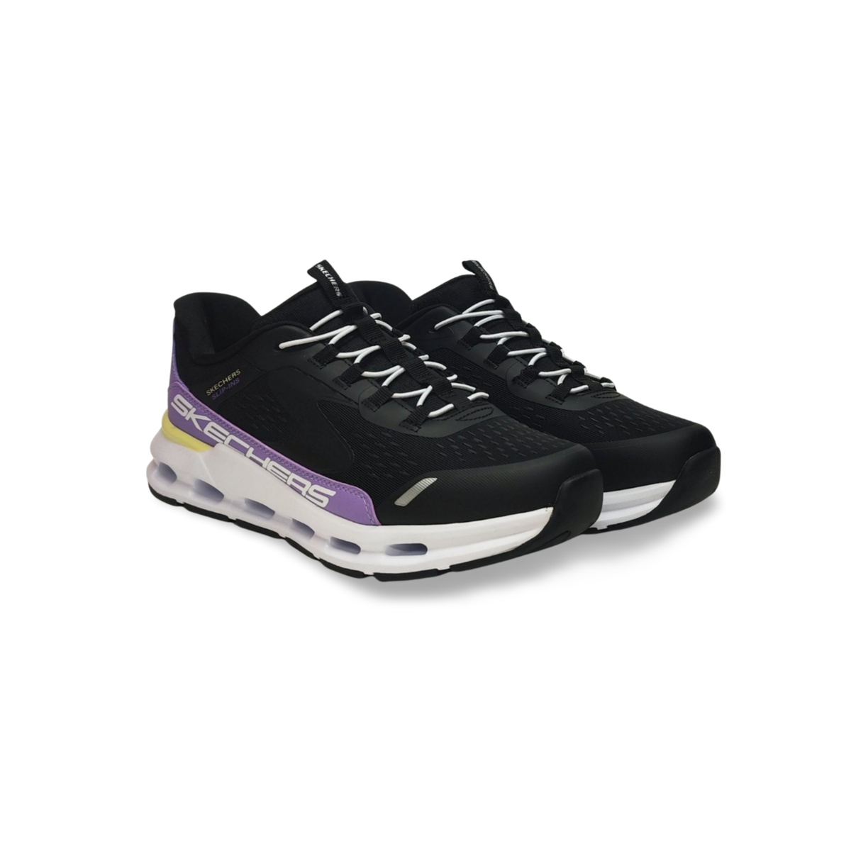 Sneakers Slip-ins donde no hará falta agacharse ni las manos para calzarte. Con una entresuela geométrica Glide-Step la cual está diseñada para proporcionar un impulso y amortiguación natural con cada paso. Plantilla Air-Coleed Memory Foam extraible,En tono negro con detalles en violeta, amarillo y blanco. Suela en tono blanco y cordones elásticos en blanco. Lavables en máquina.