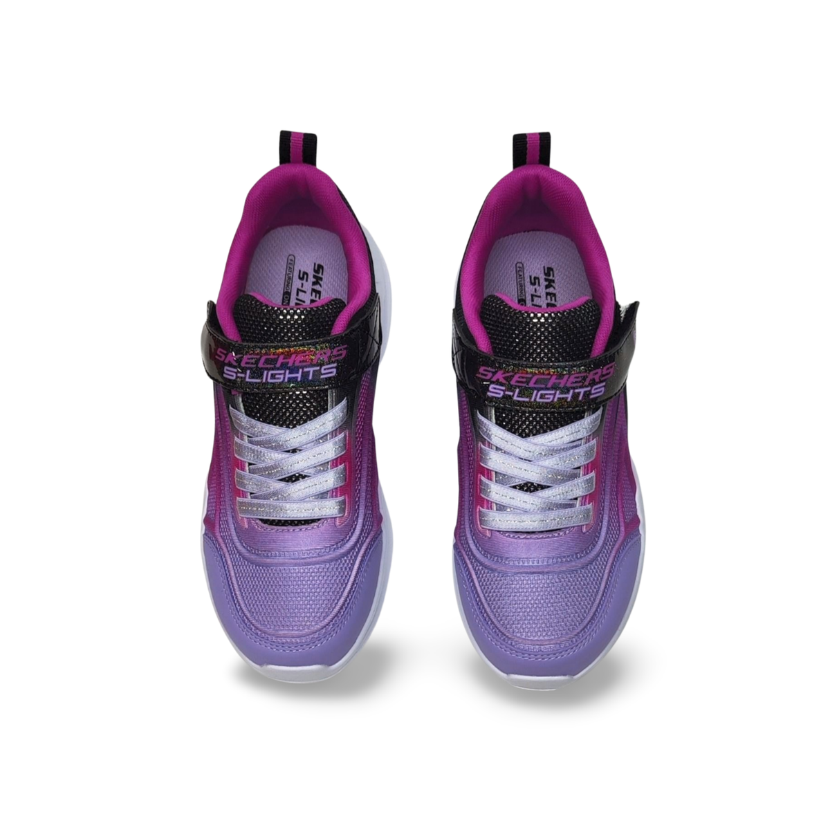 Sneakers con luces en la suela, incorpora botón ON/OFF en el cierre de velcro. Degradado de malva rosa y negro, suela en color blanco. Su plantilla es extraíble, lleva detalles en brillante en la tira de velcro.