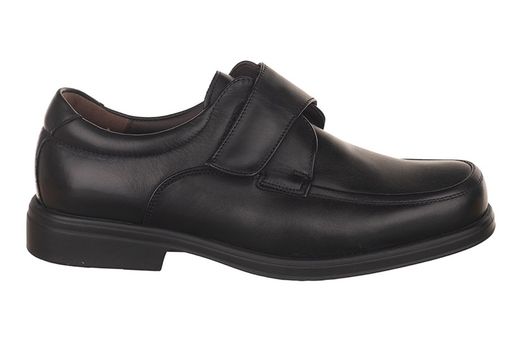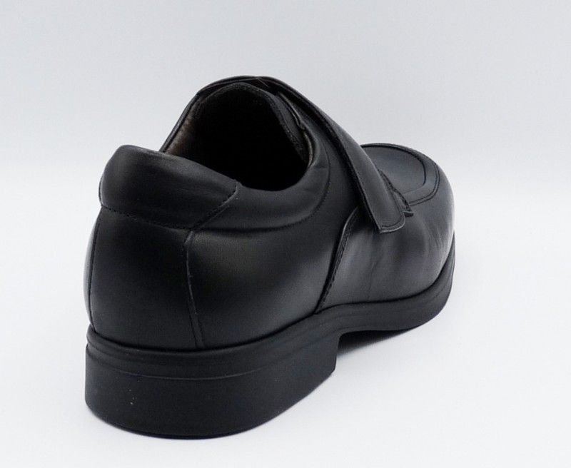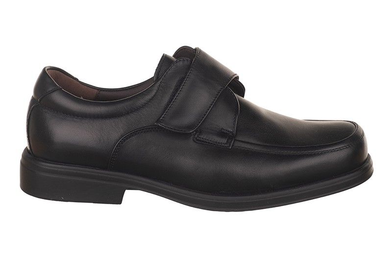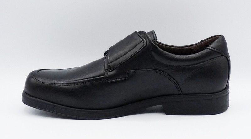 Zapato en Piel, Ancho Especial, color Negro. Plantilla Extraíble, piso antideslizante. Con Cierre con velcro. Hecho en España. Suela de polieretano, que hace que el zapato sea muy cómodo y ligero.
