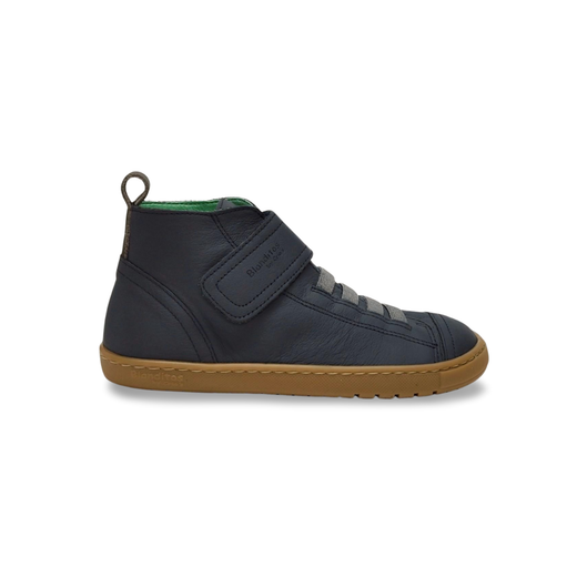 Este botín ofrece la combinación perfecta entre la sujeción necesaria para el tobillo y la libertad que el pie de tu hijo requiere para crecer de forma natural. Es el calzado ideal para el juego diario y para mantener los pies calentitos en los meses más frescos. De horma ancha que permite la libre movilidad de los dedos, como si caminaran descalzos. Suela Plana (Drop Cero) totalmente plana, sin elevación de talón, que promueve una postura y marcha naturales. Suela súper flexible permite la flexión del pie en todas las direcciones, esencial para el desarrollo muscular. De un elegante color azul oscuro que es muy sufrido y combinable. El diseño de caña alta proporciona un extra de protección. La suela de goma natural en color caramelo es un elemento de estilo clásico que también ofrece una excelente tracción. Cierre de velcro superior que permite un ajuste rápido y firme a la altura del tobillo. Tiras elásticas inferiores que simulan cordones y facilitan la entrada del pie, manteniendo la sujeción sin tener que atar.