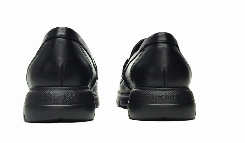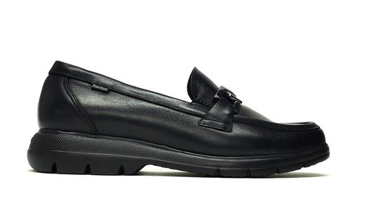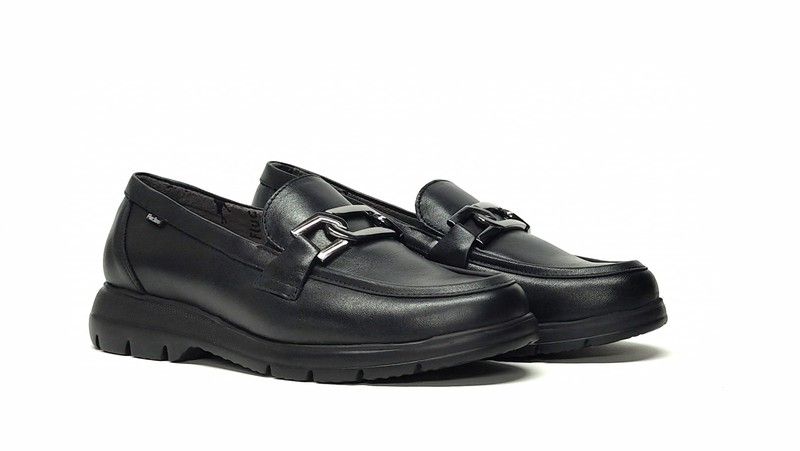 Mocasín de piel en color negro. Tiene una pieza metálica en color gris oscuro en la pala, a modo de decoración. Con acolchado de espuma en el interior. Es un modelo muy ligero que te permitirá llevarlo día a día. Además la plantilla es extraíble.