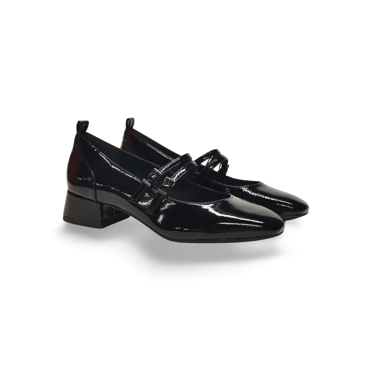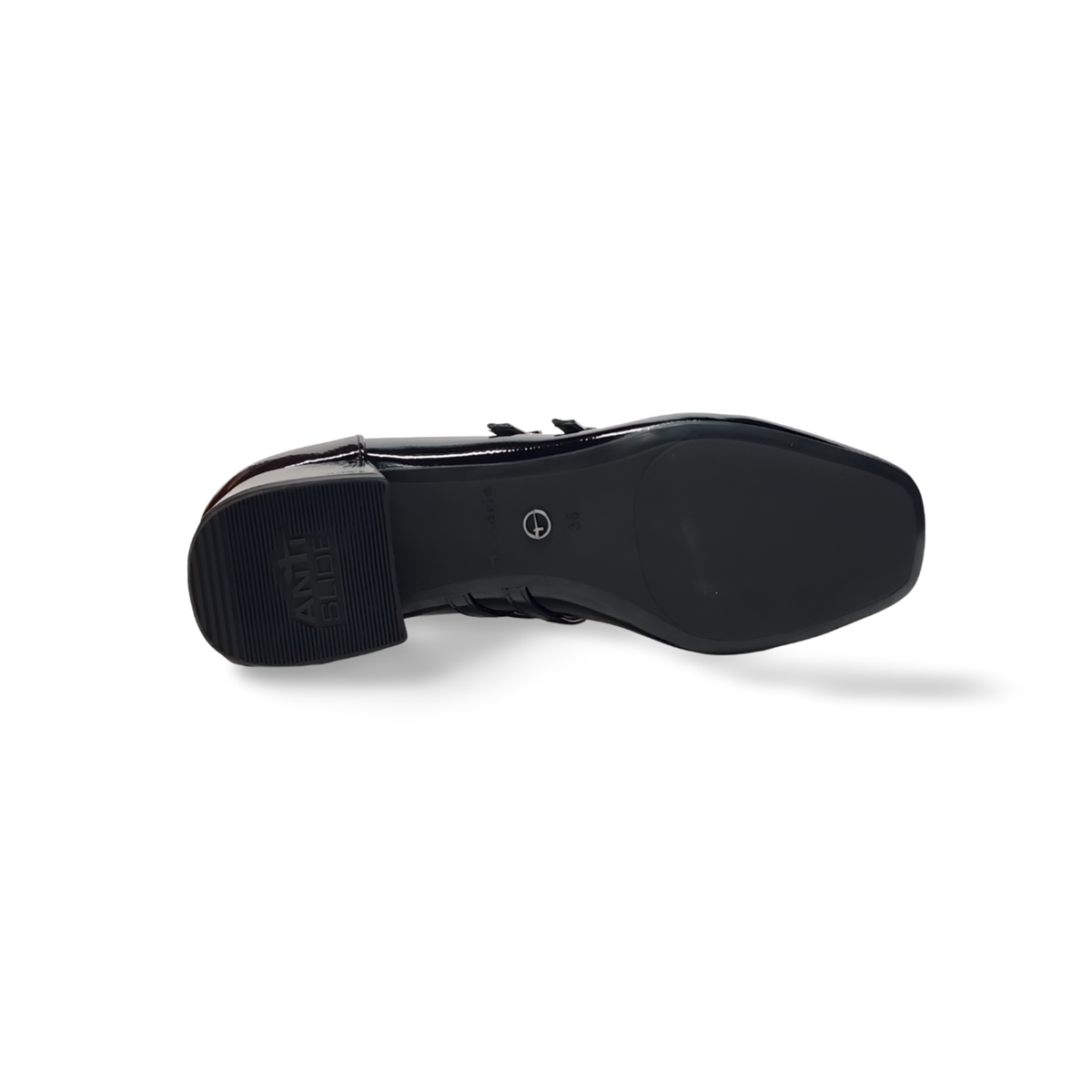 Mercedita de efecto charol en color negro. Cuenta con cierre de dos hebillas en negro, para un mayor ajuste al pie. Con un pequeño tirador en la parte trasera del talón, para facilitar su calce. La innovadora tecnología TOUCH-IT garantiza un ajuste cómodo adaptándose a la forma individual de su pie.