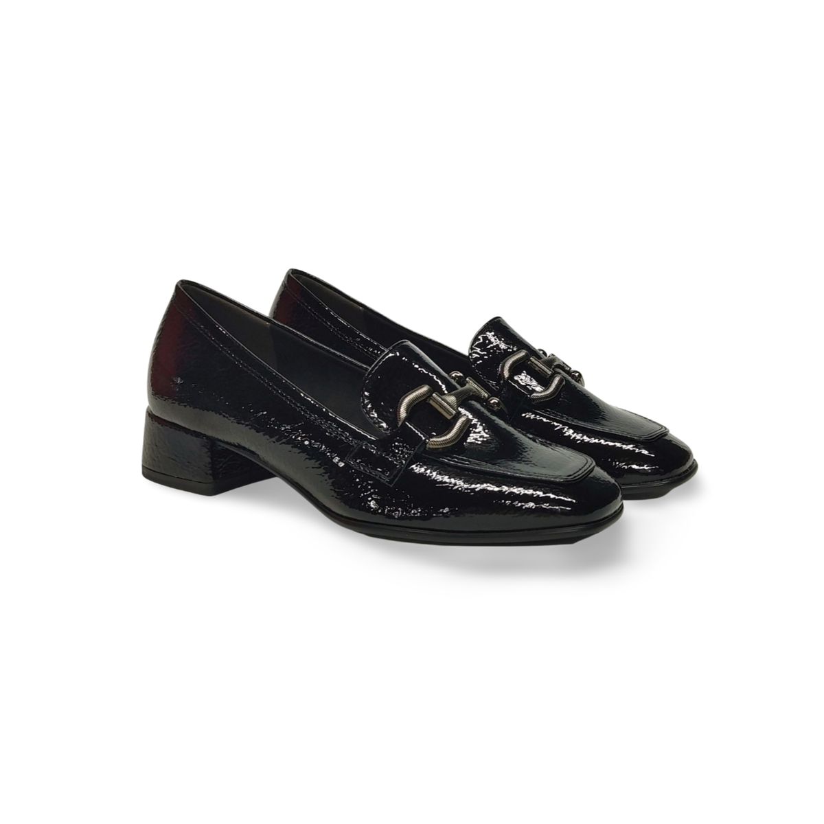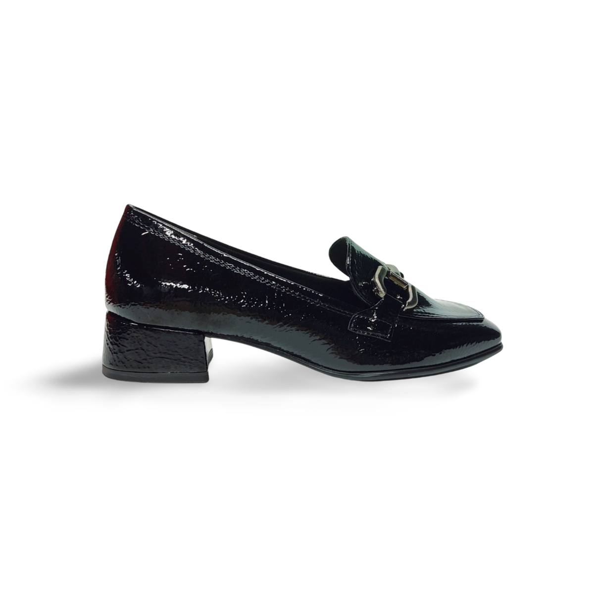 Mocasín ideal para cualquier ocasión ya que combinara con cualquier look esta temporada. En tono negro con efecto charol, pieza decorativa en tono plata envejecida y plantilla acolchada para mayor comodidad. Suela en tono negro.