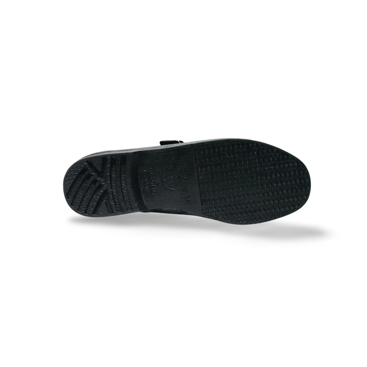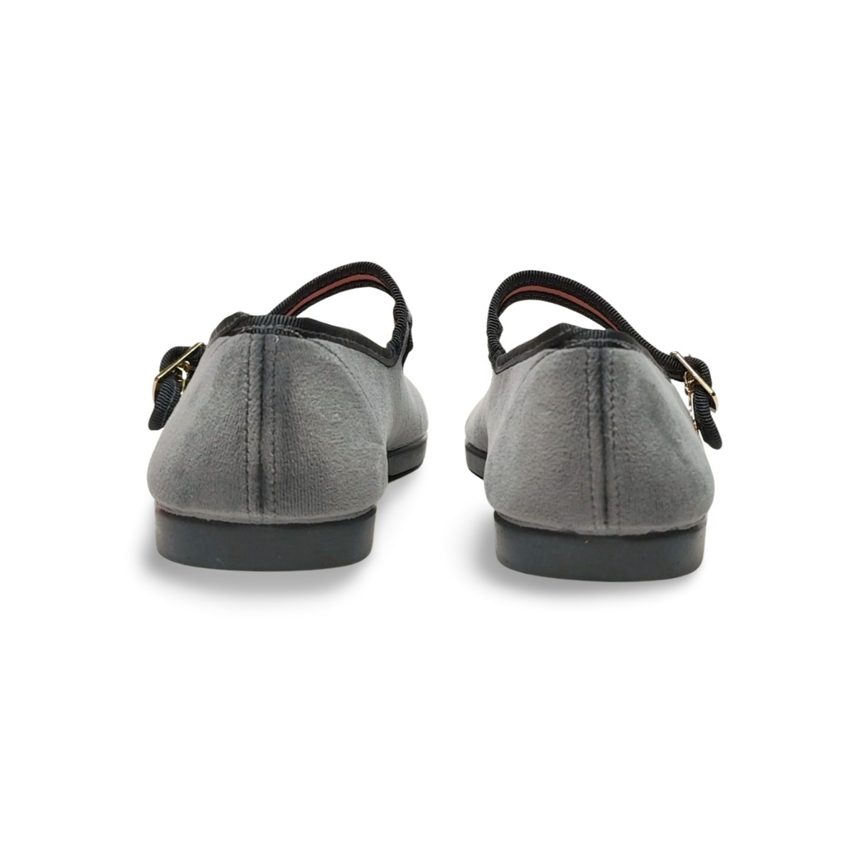 Mercedita de bellut, en color gris. Cuenta con cierre de una tira de hebilla, para un mayor ajuste al pie. Su suela es de caucho natural, para garantizar un buen agarre. Es un modelo muy ligero.