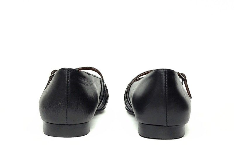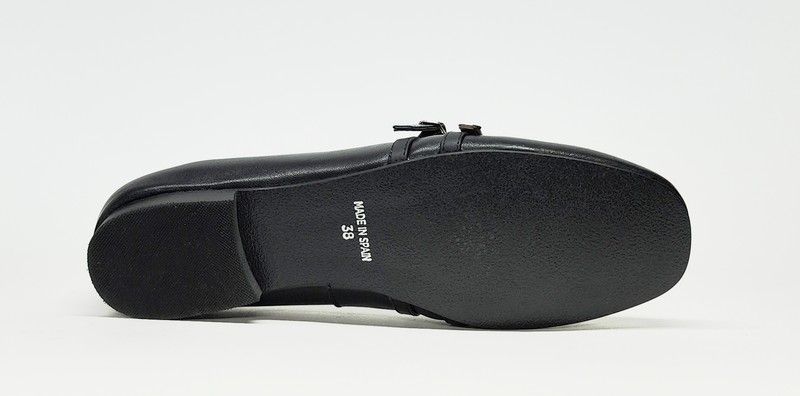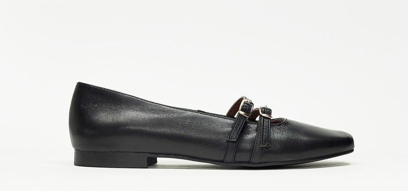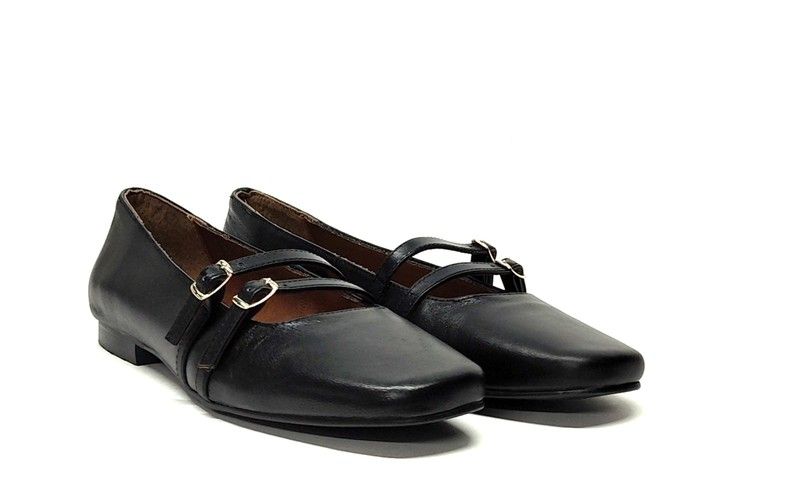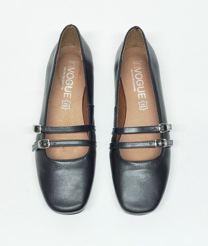 Mercedita de piel en color negro. Cuenta con cierre de dos tiras con hebilla, para una mayor sujeción al pie. Es un modelo ligero, perfecto para llevarlo en tu día a día.